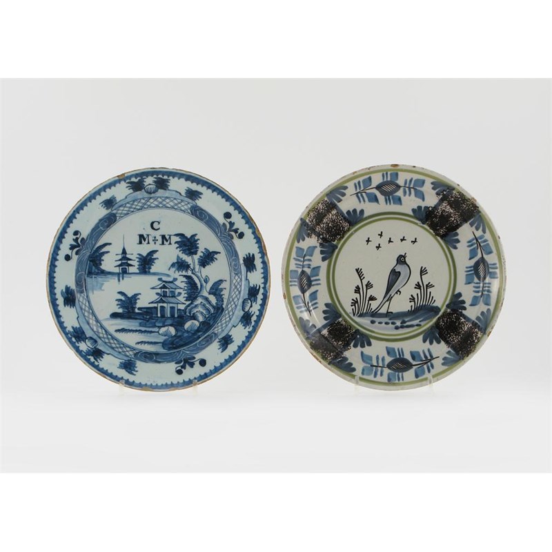 A delftware blue and white monogrammed plate, painted with pagodas in a watery landscape and the initials 'C M M', and a polychrome delftware plate decorated with a bird within sponged manganese and green line borders, 18th century, damages and restoration, 23.4cm. (2)