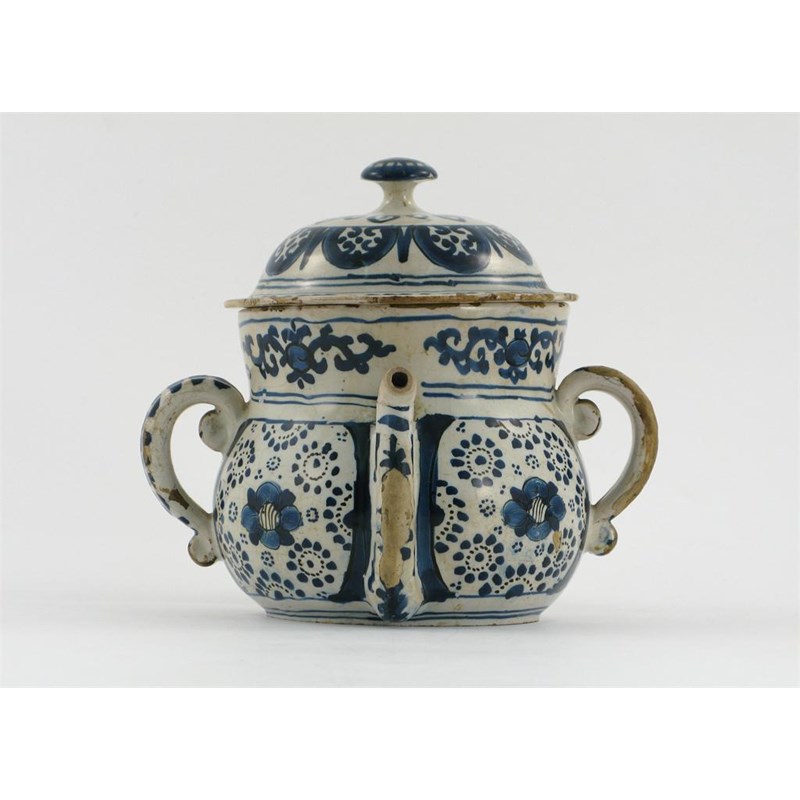 A Delft blue and white posset pot and cover, painted with four panels containing geometric floral designs, below a scrolling border, 2nd half 18th century, damages and restoration, 23cm. (2)