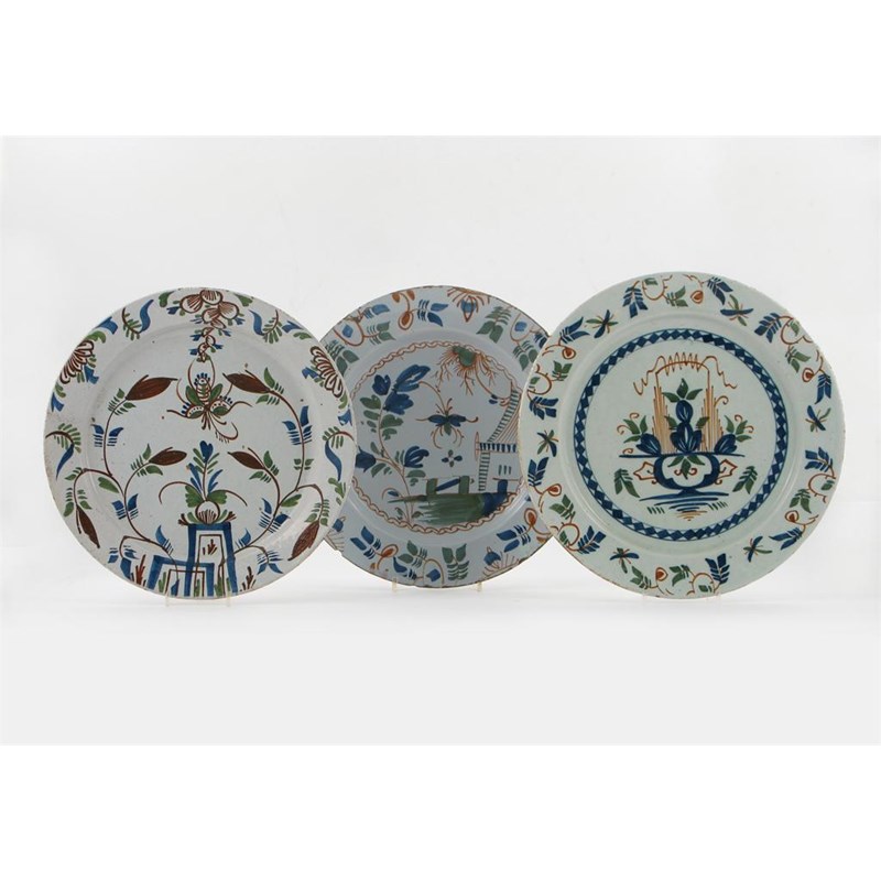 Three large delftware polychrome dishes, decorated in shades of red, blue and green with insects amidst Oriental foliage and a flower vase before a bamboo screen, 18th century, a few small chips, 34cm. (3)