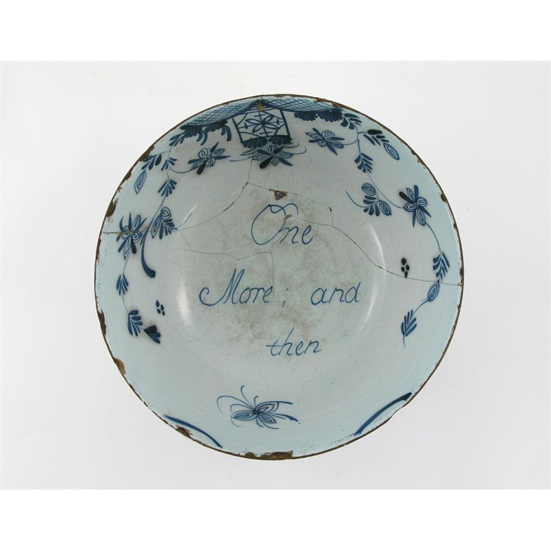 A Delftware blue and white punch bowl, the interior bearing the drinking man's slogan 'One More, and then', the exterior painted with stylized Oriental flowers and motifs, 2nd half 18th century, broken and riveted, 16.8cm.
