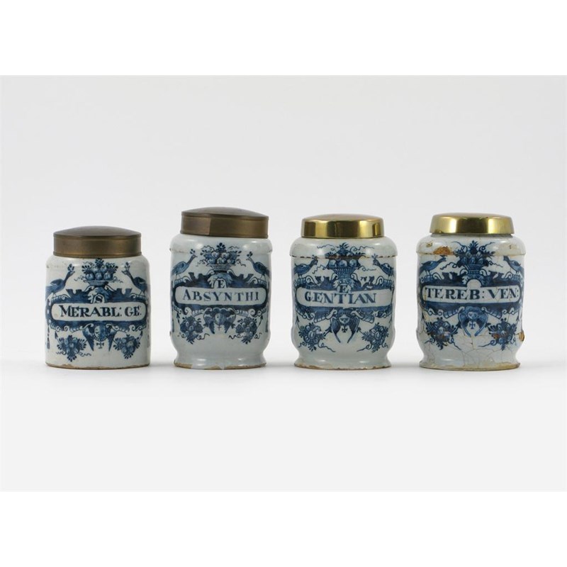 Four Delft small drug jars, each decorated with a basket of fruit between two peacocks, above cartouches inscribed with 'E: ABSYNTHI', 'S MERABL:GE', 'E GENTIAN' and 'TEREB:VEN', various marks, 18th century, damages, 11.5cm max. All with metal covers. (8)