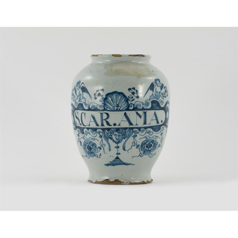 A delftware dry drug jar, bearing the slogan 'S.CAR.AMA' in a cartouche topped by a shell between two cherubs holding flowers, 18th century, some areas of overpainting to the neck, 19.5cm.
