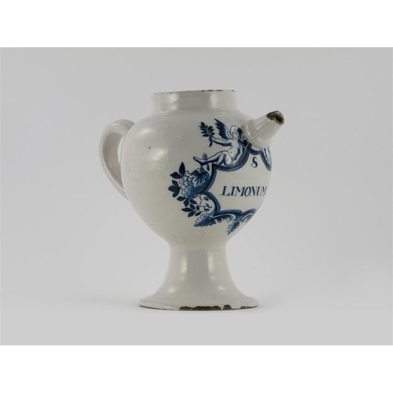 A Continental tin-glazed wet drug jar, painted in blue with cherubs holding branches above a shaped cartouche bearing the inscription 'S Limonum', 18th century, some damage to the spout and footrim, 25.5cm.