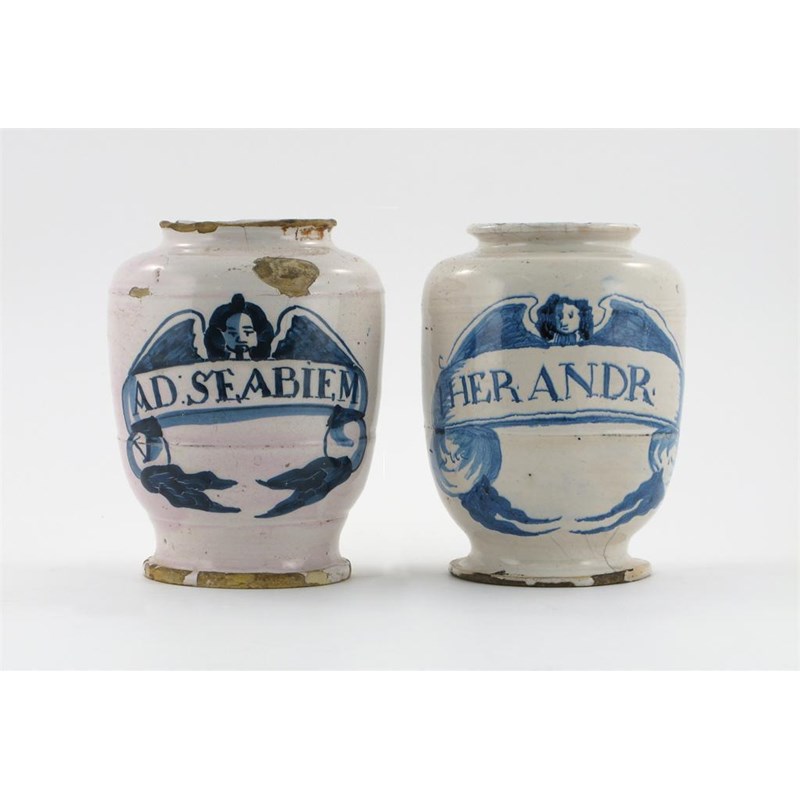 Two early delftware dry drug jars, each lightly ribbed body painted in blue with a ribbon cartouche surmounted by and angel with outspread wings, titled THER ANDR and AD:SEABIEM, late 17th century, some chipping, 19cm. (2)