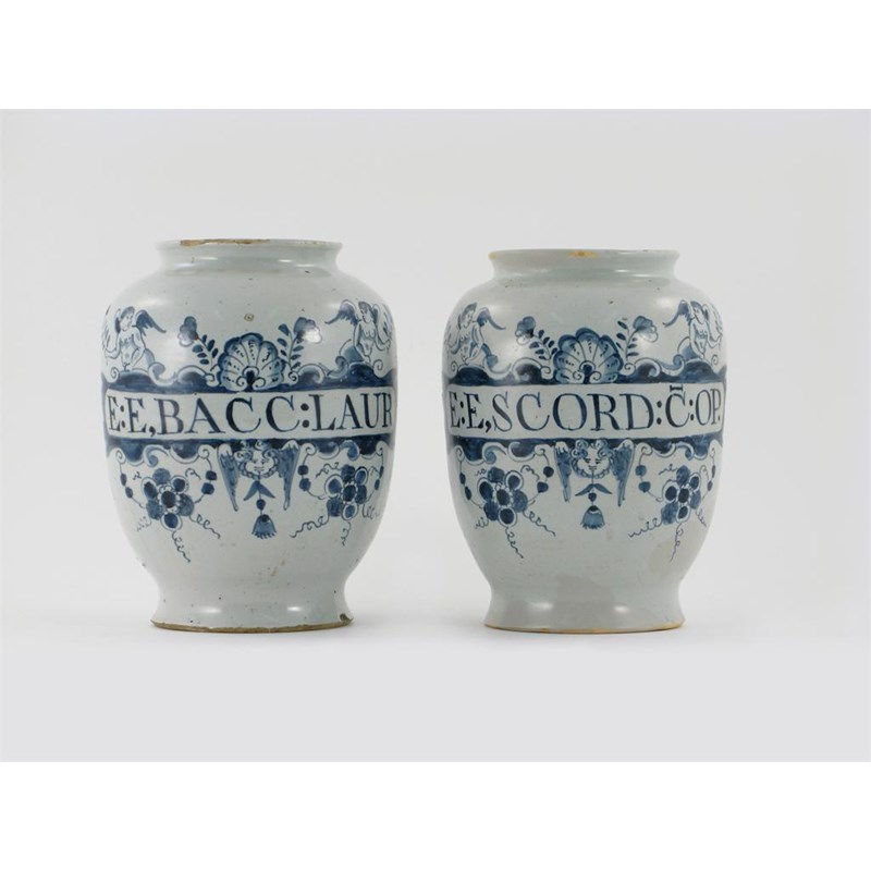 A pair of delftware dry drug jars, each painted with cherubs holding flowers above a scrolling cartouche, labelled 'E:E,BACC:LAUR' and 'E:E,SCORD:C:OP', each underside marked with a 'Q', 18th century, restoration to one, 20cm. (2)