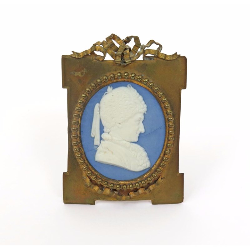 A Wedgwood & Bentley Jasperware oval portrait plaque c.1773, of Jean-Jacques Rousseau (1712-78), facing to the right and wearing a fur-edged hat and coat, impressed mark, impressed S&I, mounted in a later metal frame, broken in half and restuck, the plaque 5.2cm.