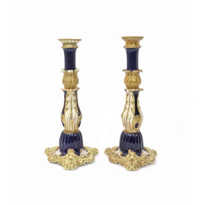 A massive pair of Chamberlain's Worcester candlesticks c.1820, of impressive size, the tall columns moulded with rococo foliate scrolls in cream and primrose yellow over rich blue, highlighted with gilt, printed marks, the sconces with metal fittings, 46.5cm. (2)