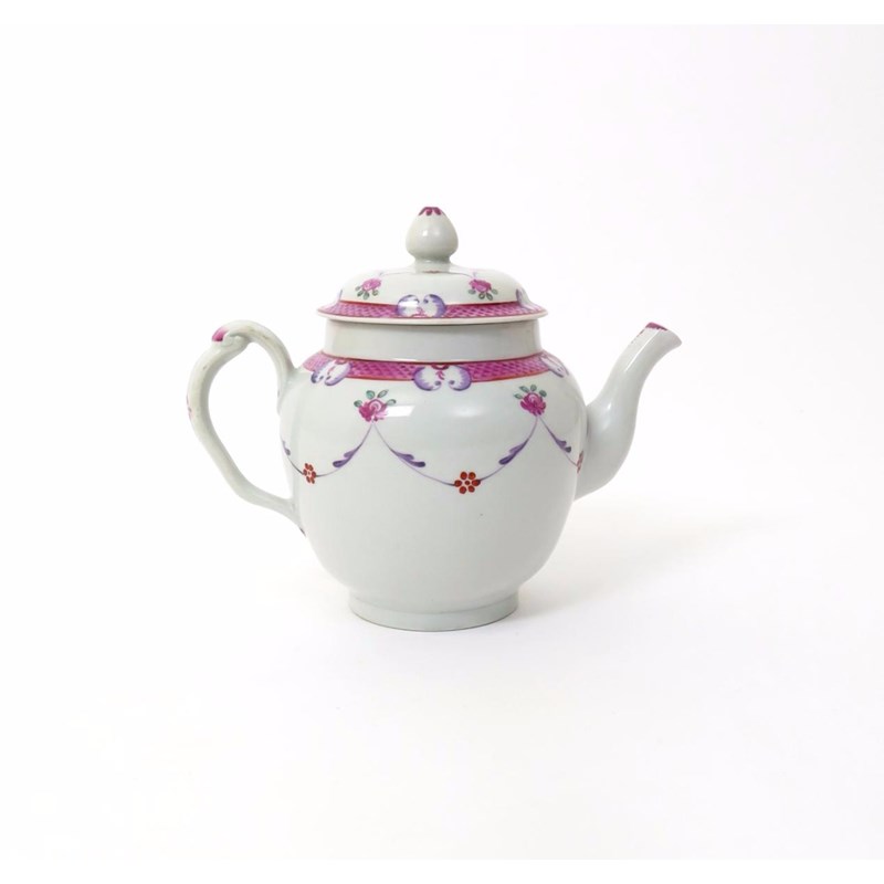 A New Hall teapot and cover c.1785-90, with a clip handle and short curved spout, simply decorated with delicate swags issuing from flowerheads beneath a pink scale border with purple C scroll motifs, some good restoration, 20cm. (2)