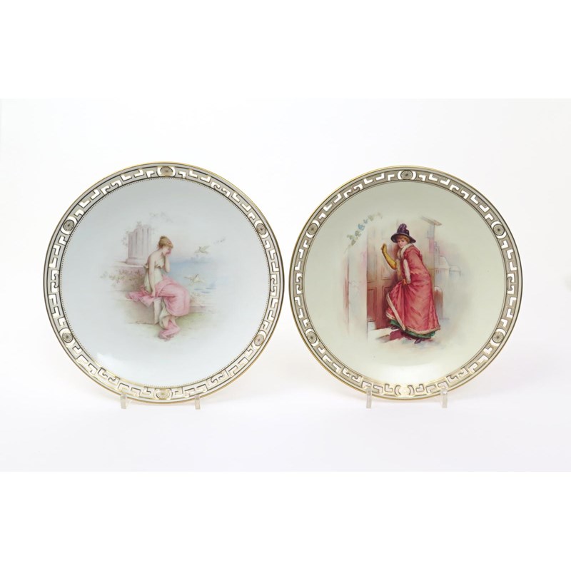 Two Minton cabinet plates c.1895-98, one painted by Antonin Boullemier with a Classical maiden seated by a ruined column and holding her face in her hand, doves in flight beside her, the other painted by John Currie with a girl wearing a long fur-lined coat and yellow gloves, knocking on a door, signed, within reticulated rims, printed and impressed marks, 24.2cm. (2)