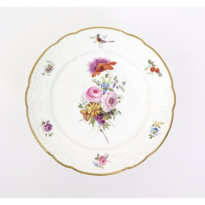 A good Nantgarw plate c.1817-20, of Brace Service type, painted in London in the Bradley workshop with a central spray of flowers, the rim moulded with flowers and C scrolls reserving six panels painted with a bird, floral sprigs and an insect alighted on cherries, impressed NANTGARW CW mark, 25cm.
