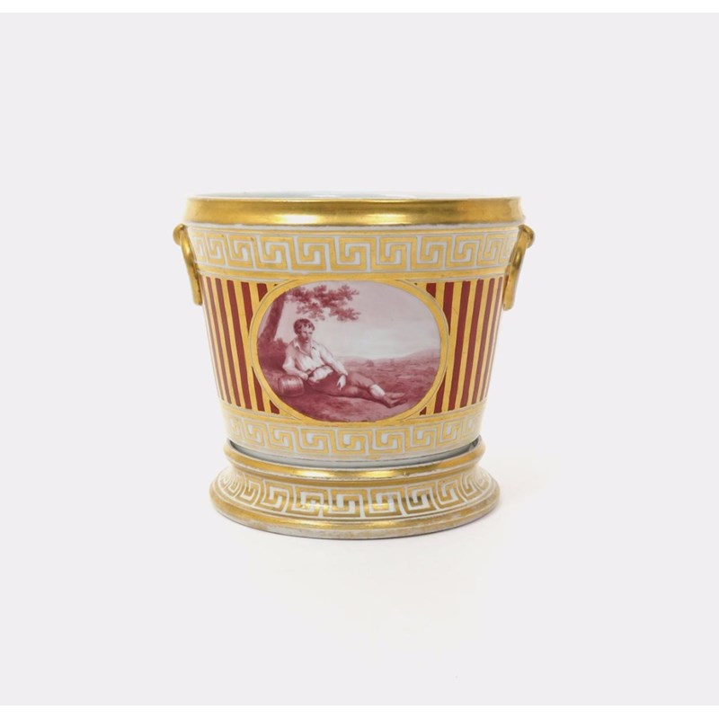 A good English porcelain câchepot and stand c.1810, of squat flared bucket form applied with ring handles, painted in sepia monochrome with a recumbent figure beside a barrel beneath a tree, reserved on a ground of gilt and burnt orange stripes between Greek key borders, decorator's numeral 4 to each piece, a little gilt wear, 13cm high. (2)