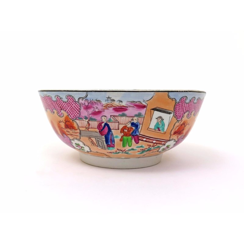 A good and large New Hall punchbowl c.1790, decorated in the Mandarin palette with pattern 425 also known as the Boy at the Window pattern, the exterior with the protagonist gazing out at three other Chinese figures in a garden, repeated three times with alternating pink scale panels, the interior with a boy with a butterfly and two Chinese ladies within an elaborate border of flowers, cell diaper, birds, butterflies and scroll motifs, painted pattern number to the base, 25cm dia.