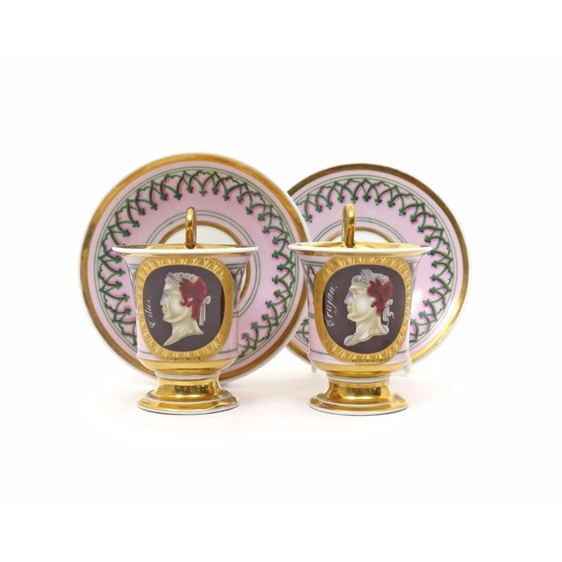 A pair of Paris porcelain cabinet cups and stands 19th century, each painted with the profile portrait of a Roman Emperor wearing a laurel leaf crown, one titled 'Trajan' the other 'Titus' reserved on a pale pink ground with a band of green Gothic tracery, the tall handles with lion mask roundels, 14.2cm. (4)