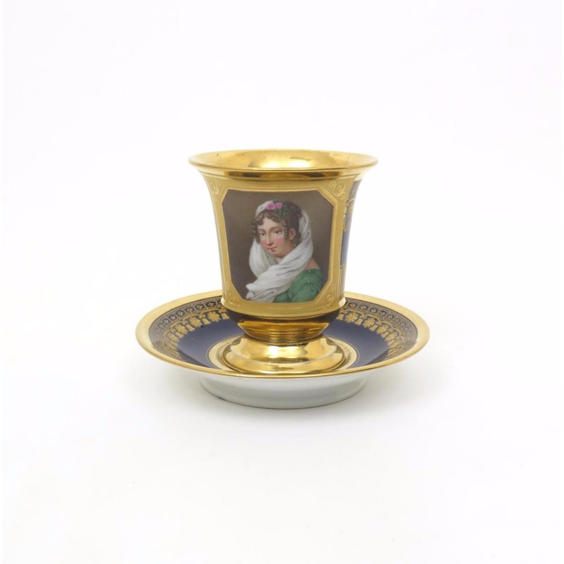 A Paris porcelain cabinet cup and saucer 19th century, painted with a chamfered rectangular panel containing the heads and shoulders portrait of a lady wearing a green dress, her hair in ringlets with pink roses, reserved on a deep blue ground with formal gilt borders, 14.5cm. (2)
