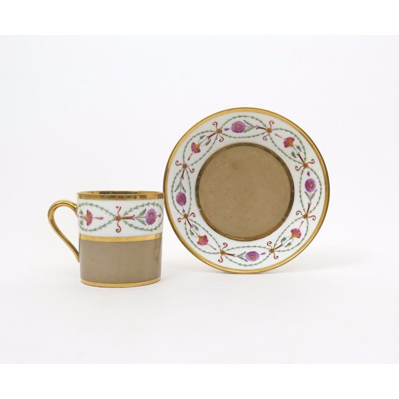 A Sèvres coffee can and saucer c.1805, painted with a formal band of convolvulus and chrysanthemum within leaf swags and scrolled motifs, reserved on a muddy café au lait ground, printed red and incised marks, 13.3cm. (2)