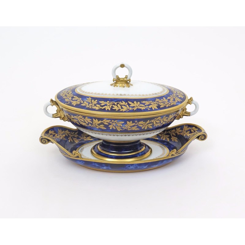 A Sèvres tureen with cover and stand date code for 1846, the oval forms decorated with a continuous foliate garland in raised gilt reserved on a marbled blue ground, green and gilt marks, 24.8cm. (3)