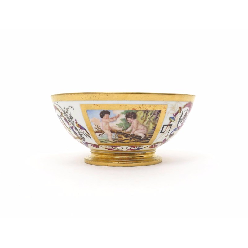 A Paris porcelain bowl 19th century, painted with a rectangular panel of two putti at play on branches, a smaller panel of a single putto harvesting corn with a sickle, the white ground brightly enamelled with further putti playing pipes and seated on elaborate leaf scrolls, the interior richly gilded, 16.5cm.