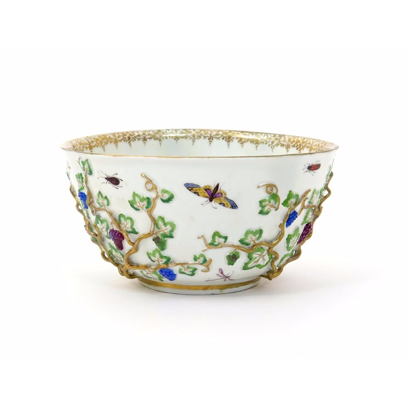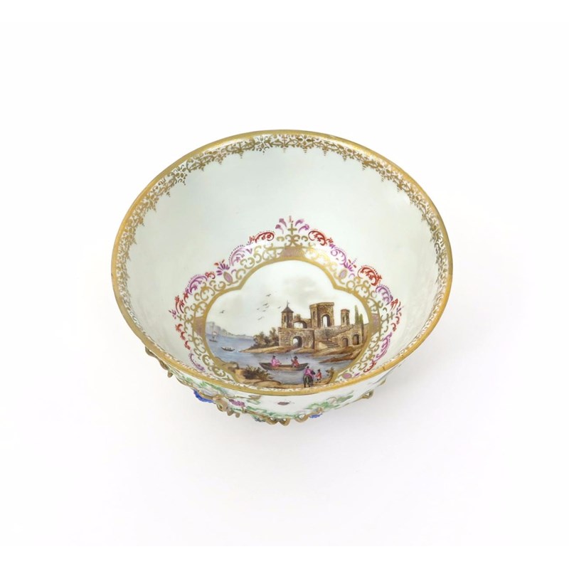 A Meissen bowl c.1745, painted to the interior with a scene of figures in boats at a quayside within a quatrefoil panel, the exterior applied with fruiting grapevine amidst painted insects, blue crossed swords mark, restored, some of the decoration perhaps later, 17.7cm dia.