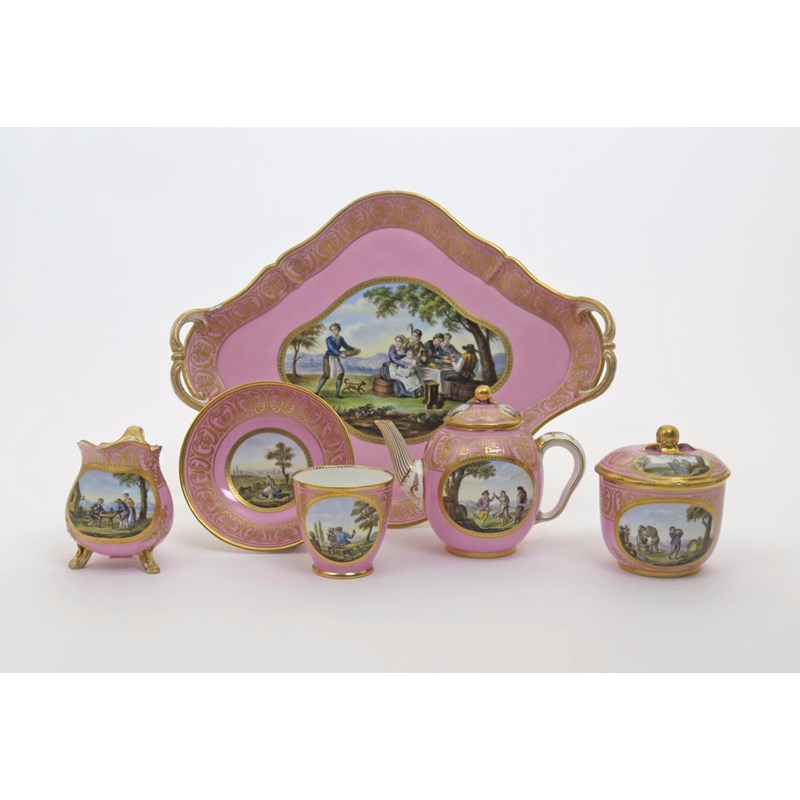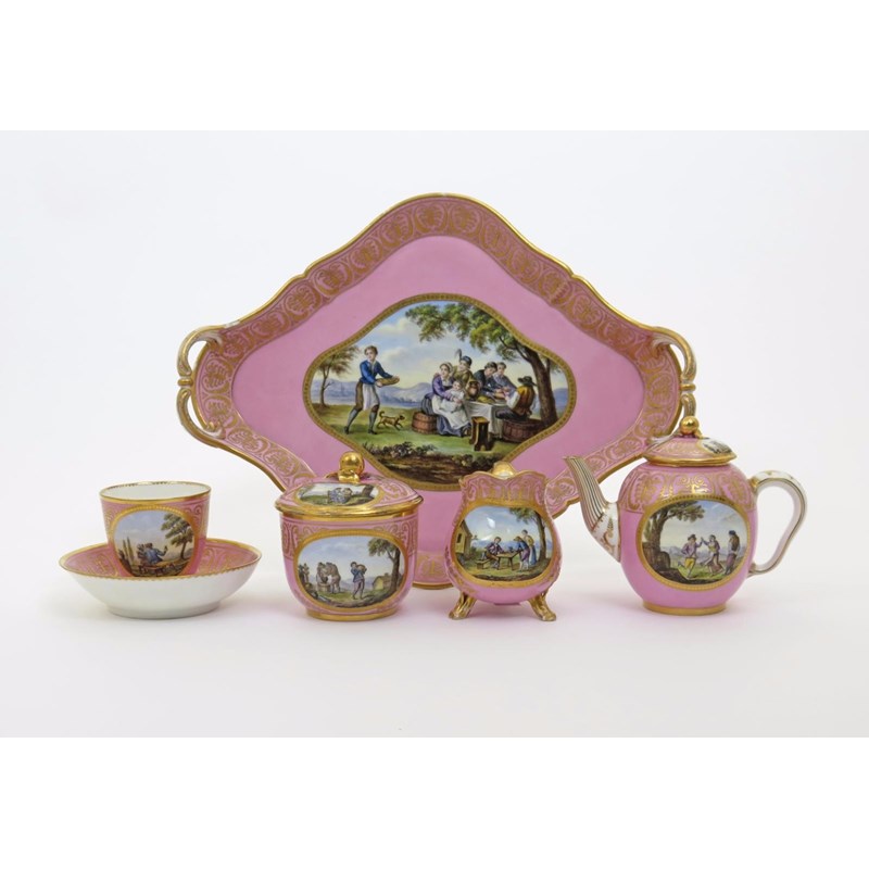 A Sèvres cabaret set date codes for 1782, painted with pastoral scenes of figures at various pursuits in rural landscapes, dancing, courting and drinking, all reserved on a pink ground with a formal gilt leaf border, blue interlaced LL marks, painter's initials of BS, possibly some later decoration. Comprising: a teapot and cover, a sucrier and cover, a milk jug, a cup and saucer, and a two-handled tray. (8)