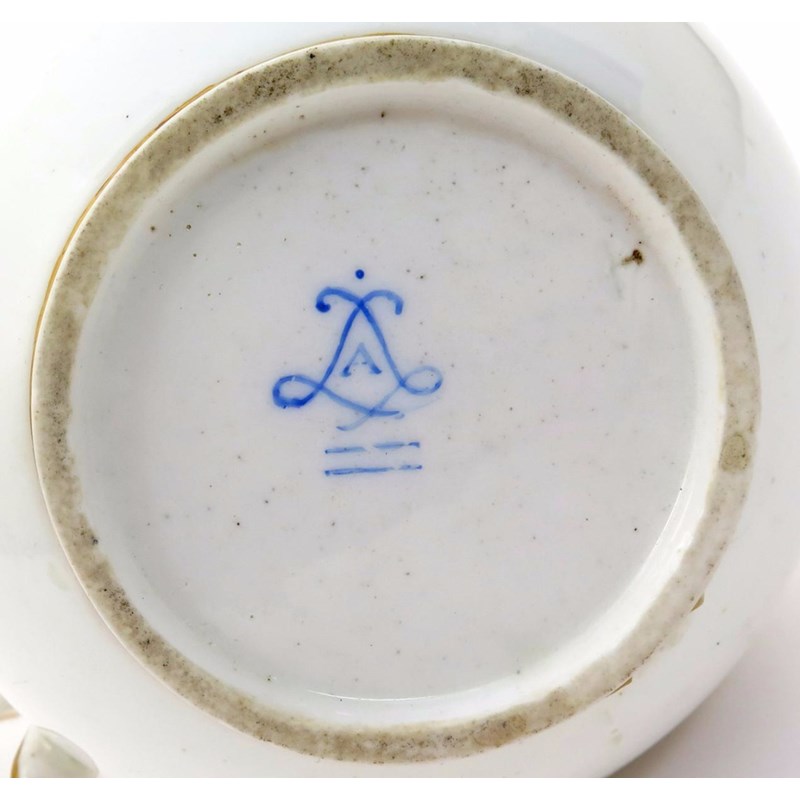 A Vincennes covered jug date code for 1753, painted by Barbet with sprays of pink and yellow roses amidst blue forget-me-nots, fitted with a gilt-metal mount to the hinged cover, blue interlaced LL mark and letter A code, painter's mark, damage and restoration, 18cm.