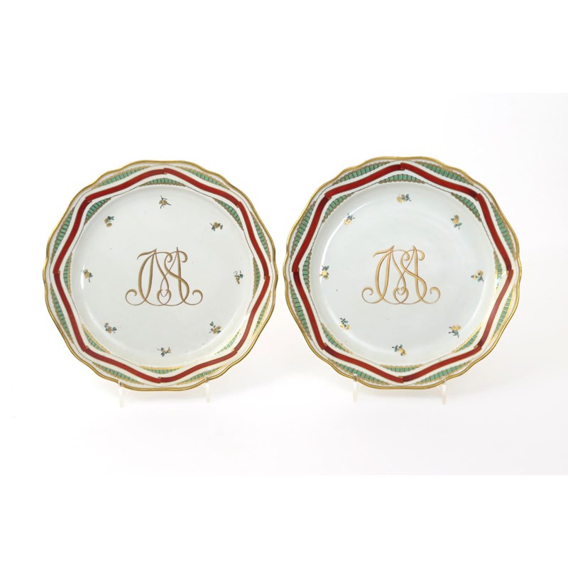 A pair of Vienna chargers 2nd half 18th century, the wells bearing the monogrammed initials CSM in gilt and red, with sparse floral sprigs and wide ribboned borders of red and green enamel within shaped rims, blue shield marks, impressed ii near the footrims, 36.8cm. (2)