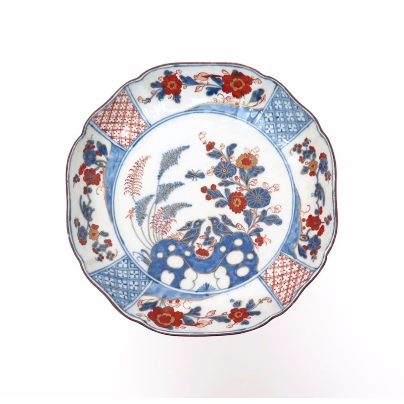 A Cozzi dish c.1760, painted in the Imari palette with a family of birds perched on holey rockwork between flowering branches and feathery stems, the shaped rim with four panels of birds perched on flower sprays alternating with narrow panels of hatched diaper in red and blue, red anchor mark, some rim faults, 22.2cm.