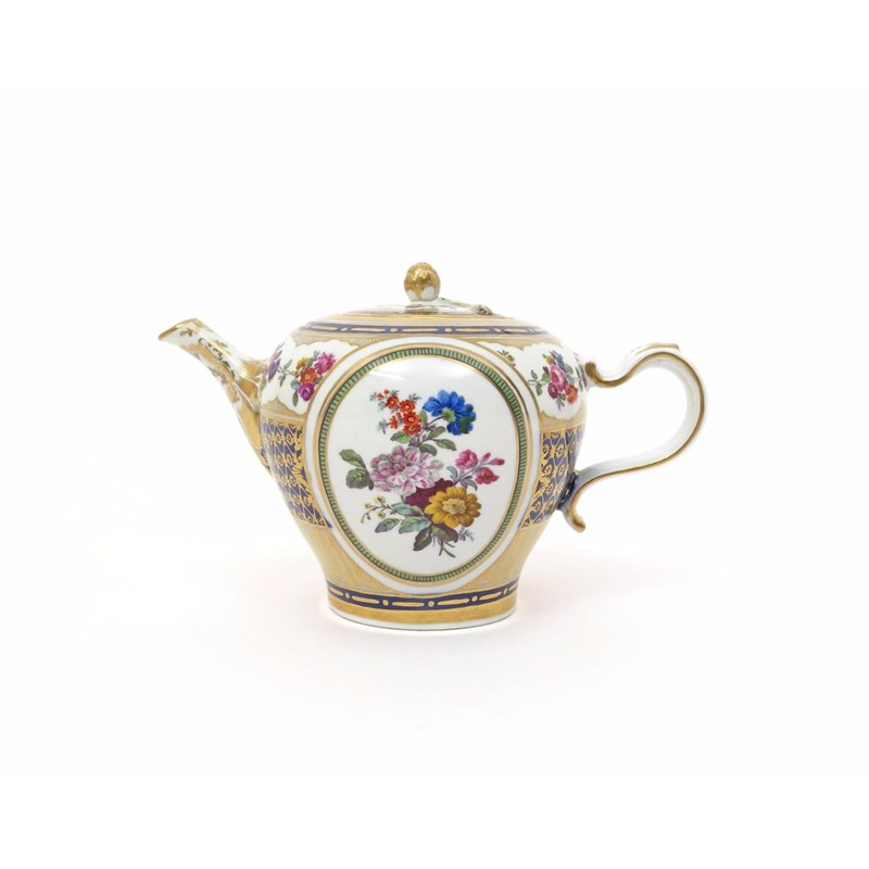 A Vienna teapot and cover c.1760, the inverted pear body painted in the Sèvres manner with a fine oval panel of flowers to two sides, reserved on a blue ground with gilt hatching beneath a continuous shaped floral garland border, blue shield mark and impressed i, some good restoration to the cover, 16.5cm. (2)