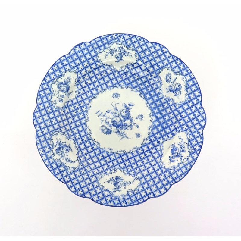 A rare blue and white Chantilly plate c.1780, finely painted with a central panel of moths in flight around roses and other flowers, reserved on a dense latticework ground with six further small floral panels, blue hunting horn and R mark, 24.5cm.