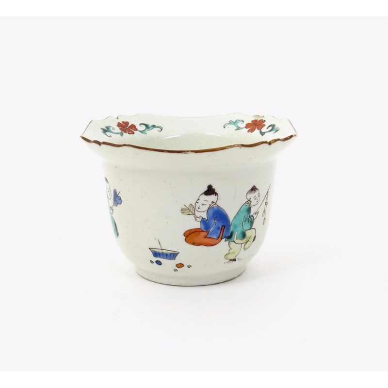 A Chantilly beaker or mortar c.1735, painted in the Kakiemon palette with four Japanese boys holding fans and other objects, the reverse with two birds in flight, the shaped everted rim with a stylized floral motif to each corner, a chip to the rim, 5.5cm high.
