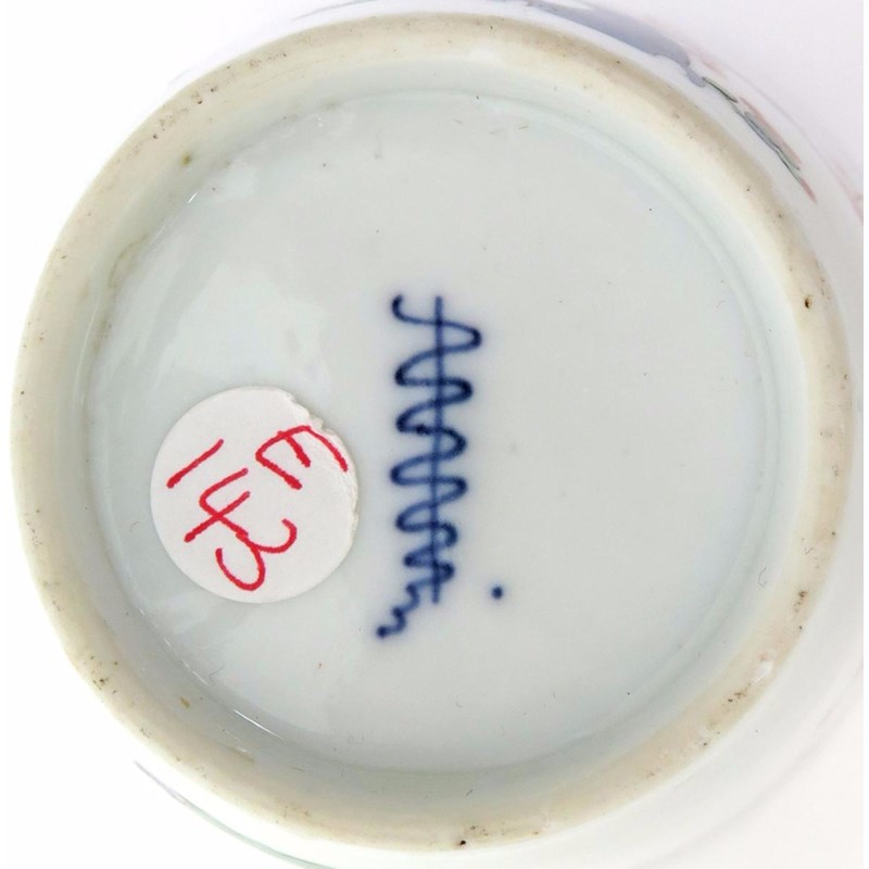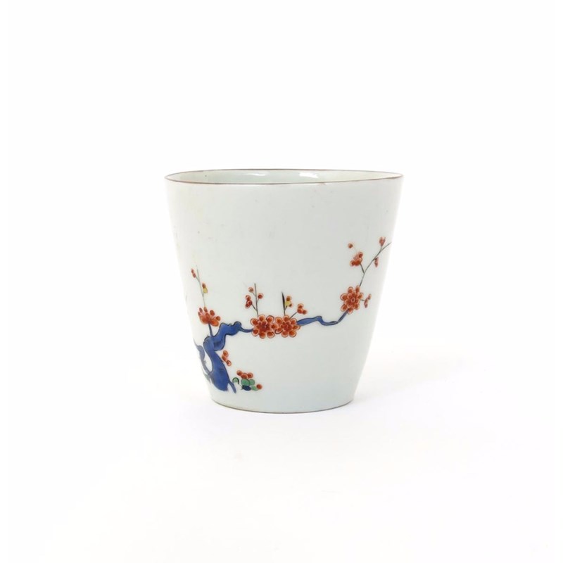 A Meissen beaker c.1730, the flared straight sides painted in the Kakiemon palette with a gnarled spray of prunus, the reverse with a single bird in flight, brown line rim, caduceus mark in underglaze blue, 7.5cm.
