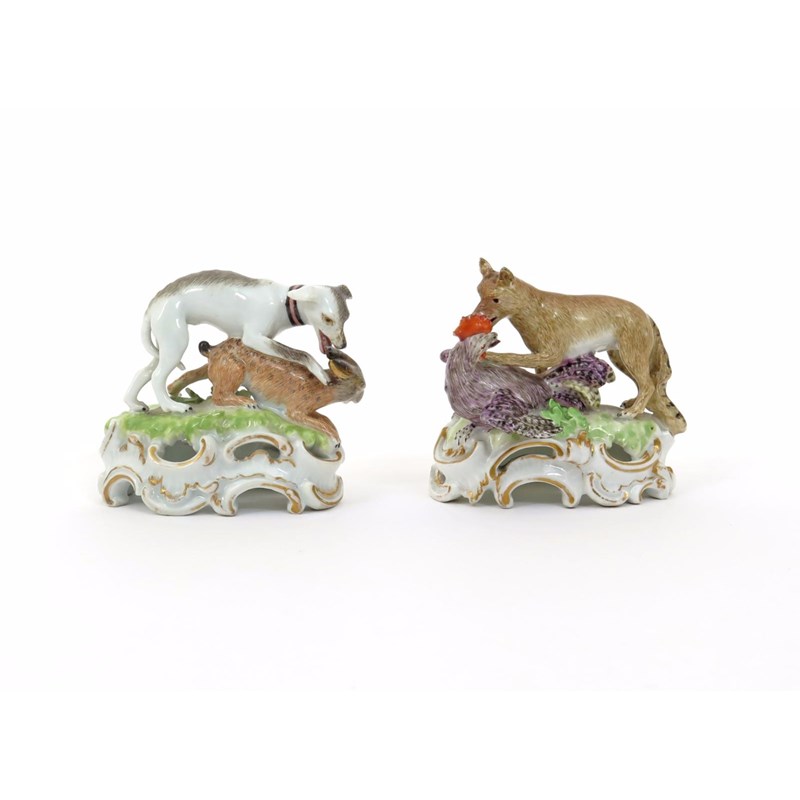 A pair of Meissen hunting groups c.1775, one of a dog and a hare, the other of a fox and chicken, each towering over their prey, raised on pierced scrolled bases, blue crossed swords and star marks for the Marcolini period, minor damages and restorations, 6.5cm high. (2)