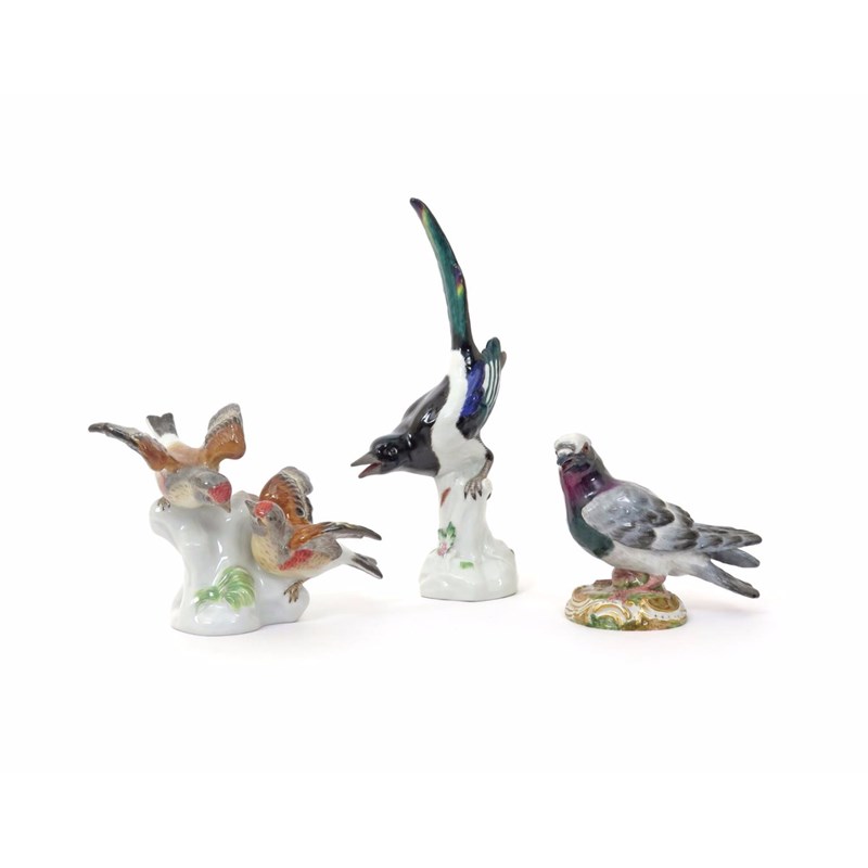Three Meissen bird groups 20th century, comprising a pair of finches perched on a low stump with wings outstretched, a dove or pigeon with beak agape and naturally coloured plumage, and a magpie with tail erect and beak agape, blue crossed swords marks, minor damages, 20cm max. (3)