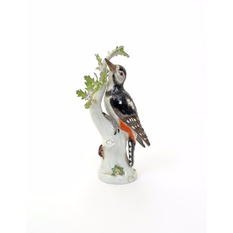 A Meissen model of a Greater Spotted Woodpecker modern, characteristically perched in the branches of an oak tree, with head turned slightly to sinister, wings folded, a stag beetle crawling the other side of the branch, blue crossed swords mark, minor damages, 26cm.