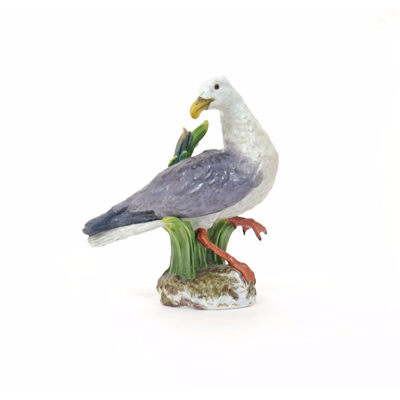 A Meissen figure of a seagull 19th century, standing amidst reeds with his left foot raised, naturalistically modelled and painted, his head turned over his right wing, blue crossed swords mark, some restoration, 27cm high.
