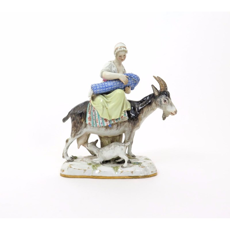 A Meissen figure of the Tailor's Wife 19th century, seated side-saddle on the back of a nanny goat at which a kid suckles, breast-feeding her own swaddled baby, blue crossed swords mark, restoration to the goat's horns and ears, 18cm high.