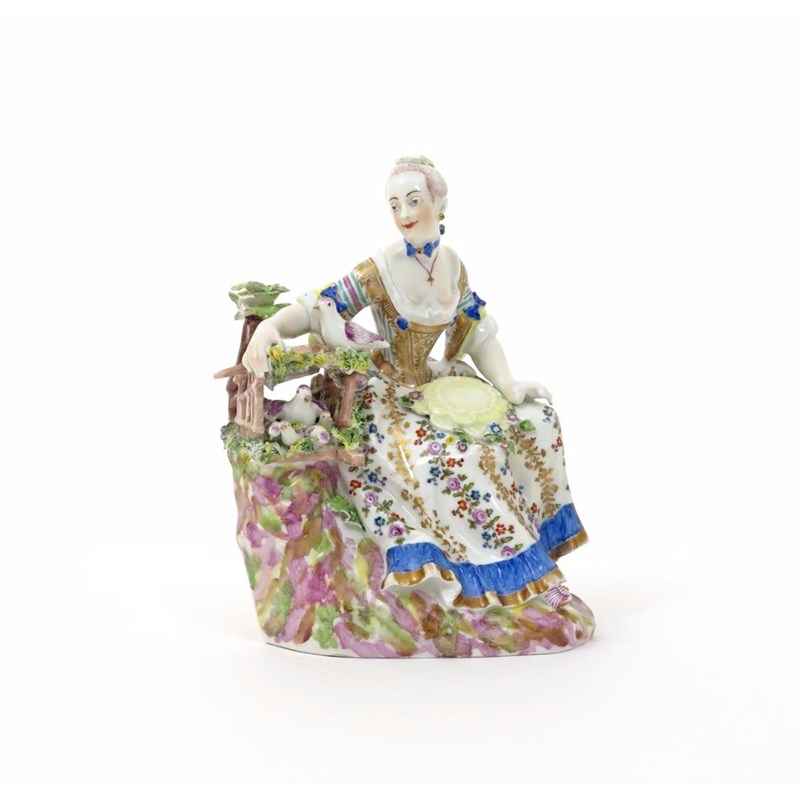 A Vienna figure of a lady late 18th century, seated beside a tree stump on which rests a dovecote containing a dove with four chicks, a further dove perched atop, blue shield mark, minor damages, 17cm.