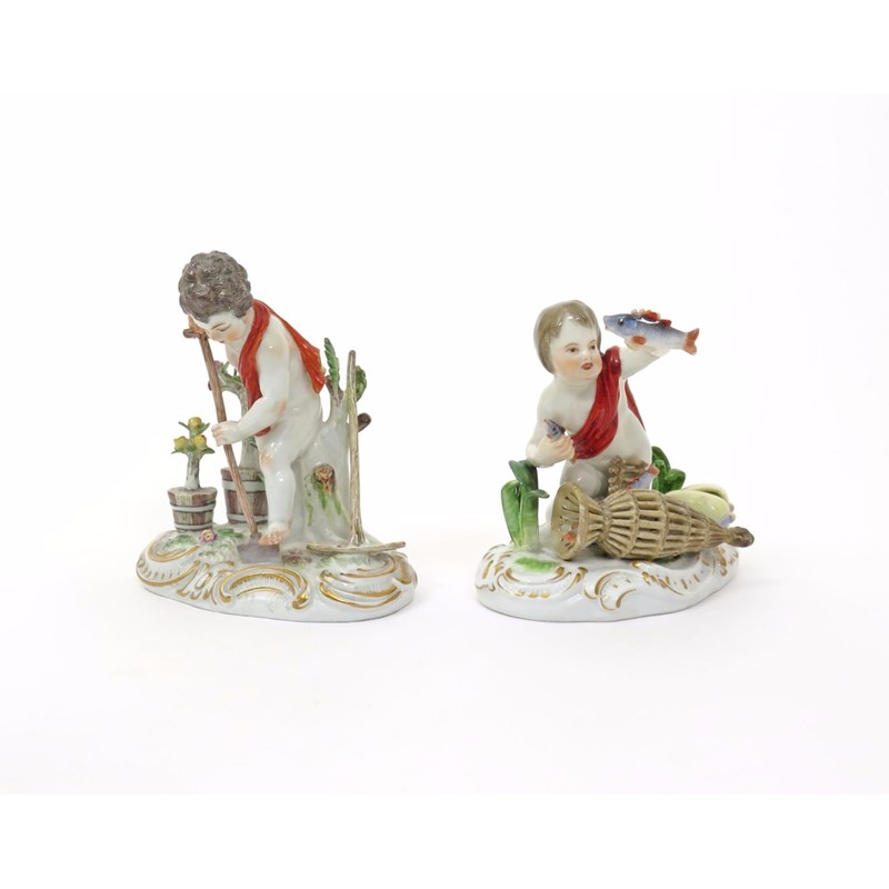 A near pair of Meissen figures of putti emblematic of the Elements 19th/20th century, after the models by J J Kändler, one representing Earth, digging with a spade, two potted rose bushes to one side, the other Water with a putto pulling fish from a basket, an upturned creel to one side, blue crossed swords marks, incised C98 and C100, a few small restorations, 12cm. (2)