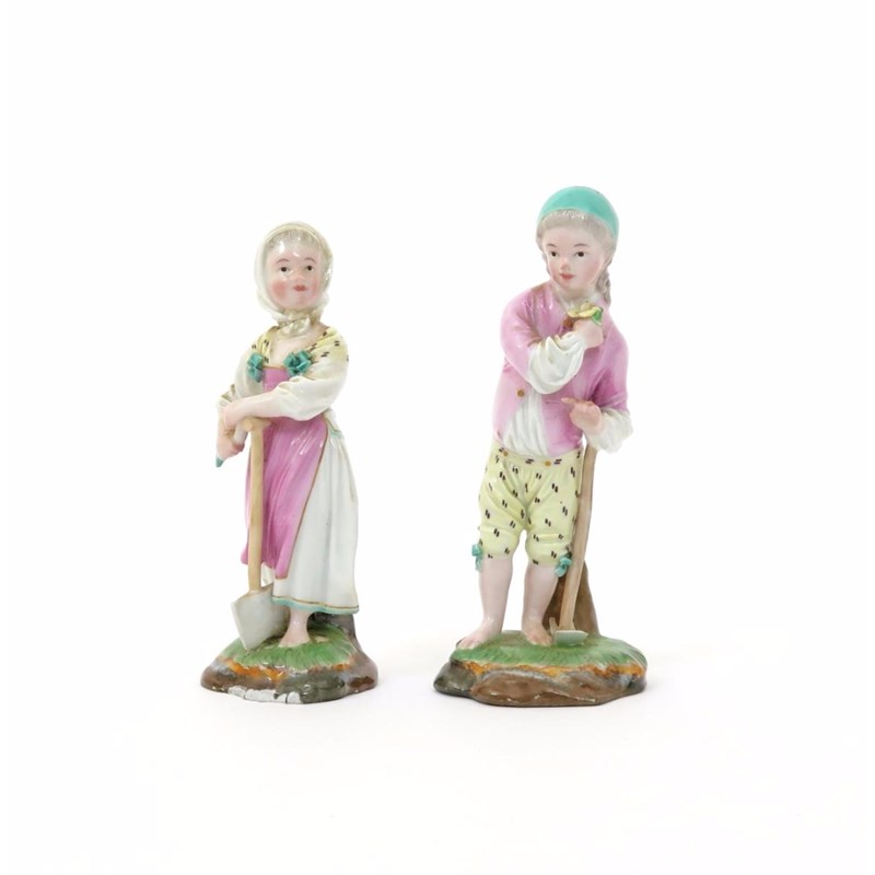 A pair of Höchst figures of young gardeners c.1770-80, he leaning on an adze and holding a single flower, his companion holding a carrot and resting one hand on her spade, each raised on a low grassy base, blue wheel and incised marks, some damages to the companion, 13.5cm. (2)