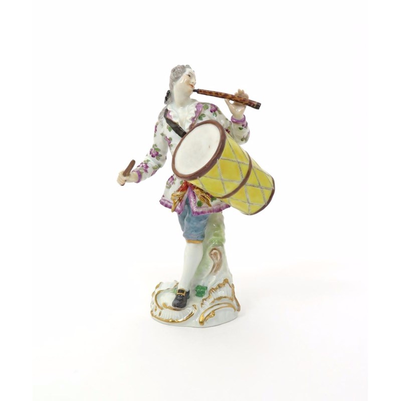 A Meissen figure of a drummer 1st half 20th century, a long yellow drum suspended from a strap over one shoulder, playing the clarinet and holding a drumstick in his right hand, wearing a flowered tunic over blue breeches, blue crossed swords mark, a few small repairs, 18.5cm.