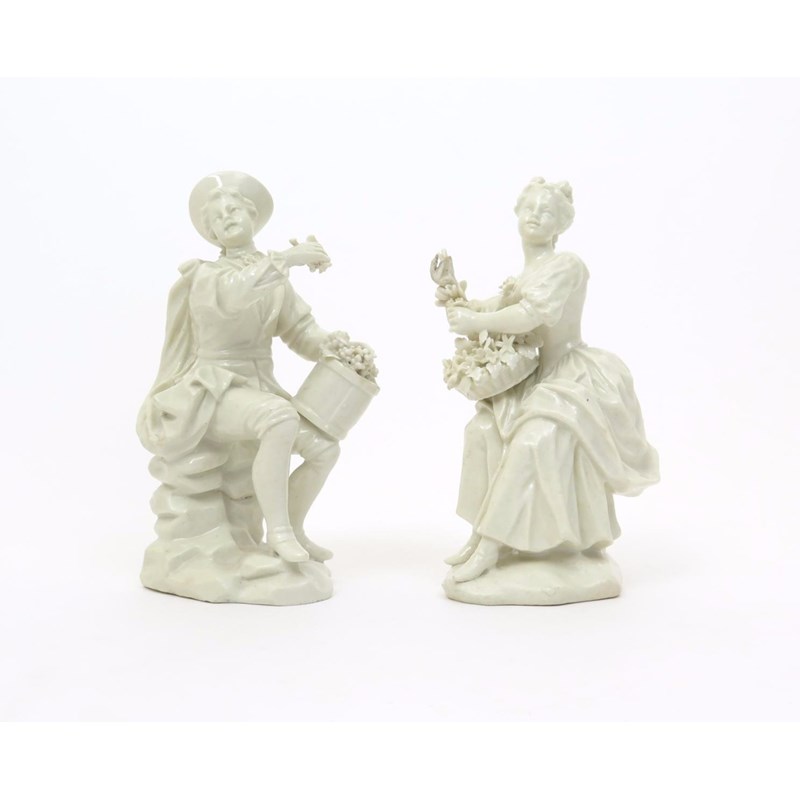 A pair of French soft-paste porcelain figures mid 18th century, modelled as a vintner and his companion, each seated on a rocky stump, he wearing a cloak and with a drum of grapes resting on one knee, she with a basket of flowers, a small posy tucked into the top of her dress, minor damages and restorations, 18cm. (2)