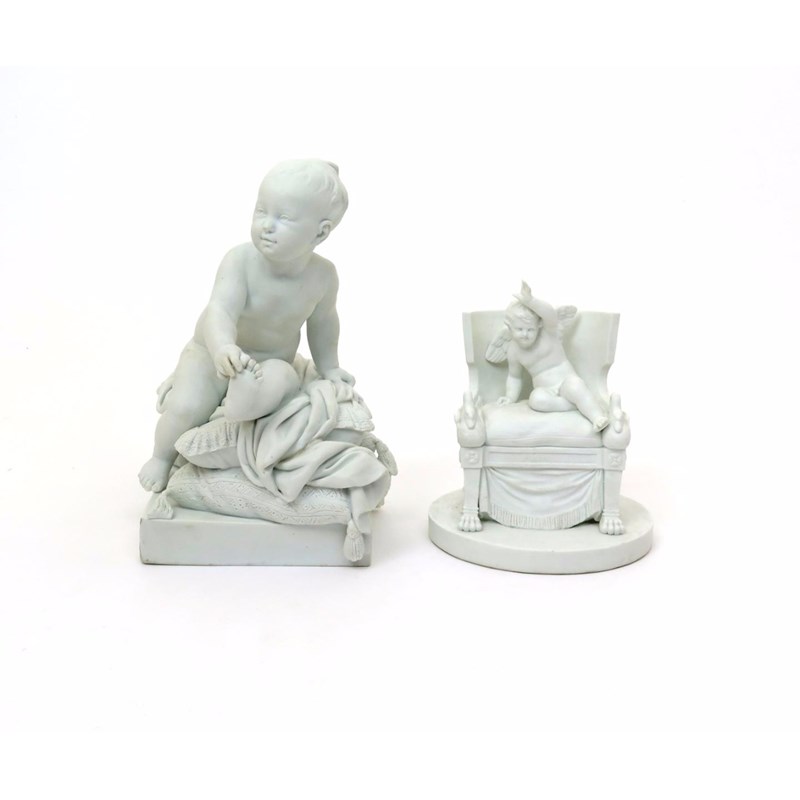Two Sèvres biscuit porcelain figures 19th century, one of Madame Royale or Enfant aux Coussins, modelled after Boizot after an original by Clodion, as a baby playing with the toes on her left foot, seated on a pile of cushions, the other of Cupid seated on a high-backed chair with swan-head arm rests, incised marks to the reverse including the initials AB, 23.5cm max. (2)