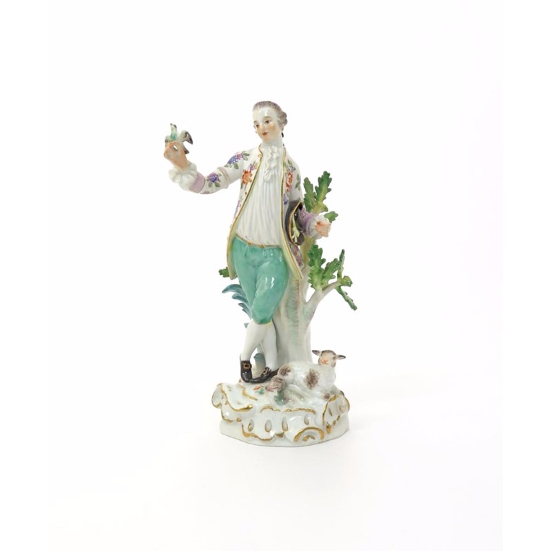 A large Meissen figure of a shepherd 20th century, standing and leaning on a leafy tree stump, a sheep recumbent at his feet, a bird perched with wings outstretched on the fingers of his right hand, some small restorations, 26cm.