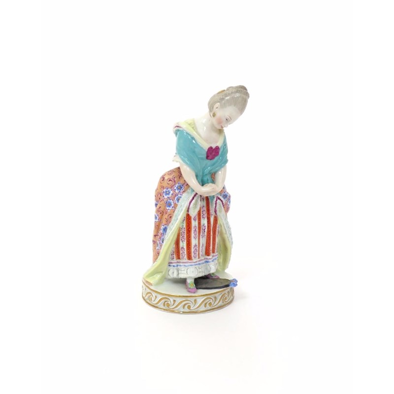 A Meissen figure of a girl with a broken mirror 19th century, standing with hands clasped and gazing regretfully down to the cracked object at her feet, wearing an elaborate floral bustle over a striped underskirt, raised on a circular scrolled base, blue crossed swords mark, a small amount of restoration to the edge of the mirror, 15cm.