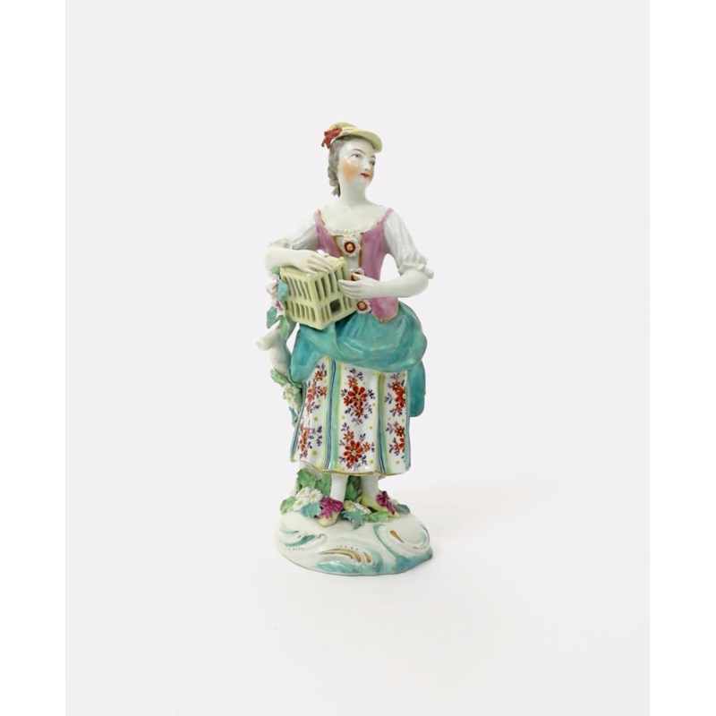 A Derby figure of Matrimony c.1765, personified as a maiden holding a small bird cage which rests on her right hip, wearing a gathered green apron over a striped floral skirt, the low scrolling base applied with flowers and leaves, a little restoration to the tree stump behind, 23cm.