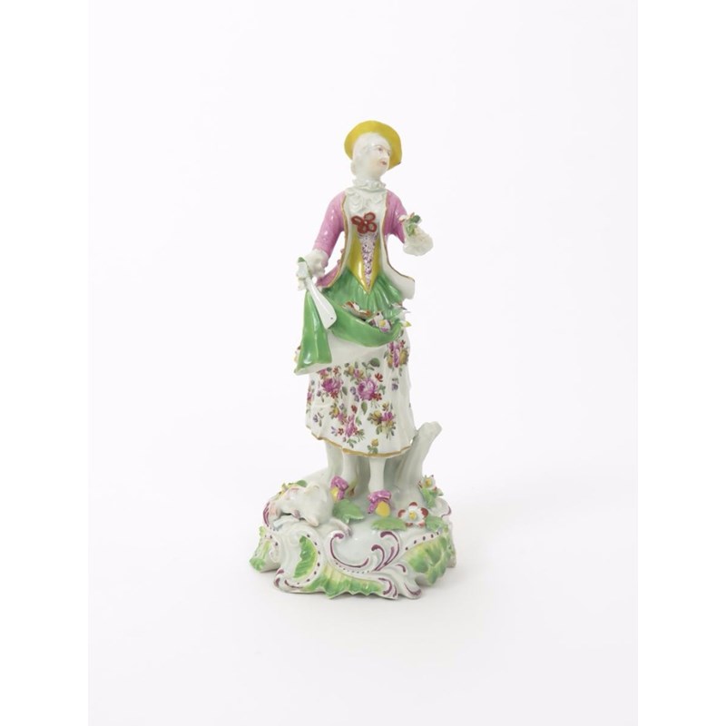 A Derby figure of a shepherdess c.1755-60, standing with a recumbent lamb at her feet, wearing a pink jacket over a yellow bodice and flower skirt, holding on corner of her green apron in her right hand, a small posy in her left, raised on a scrolled base applied with flowers and leaves, some restoration, 22.5cm.