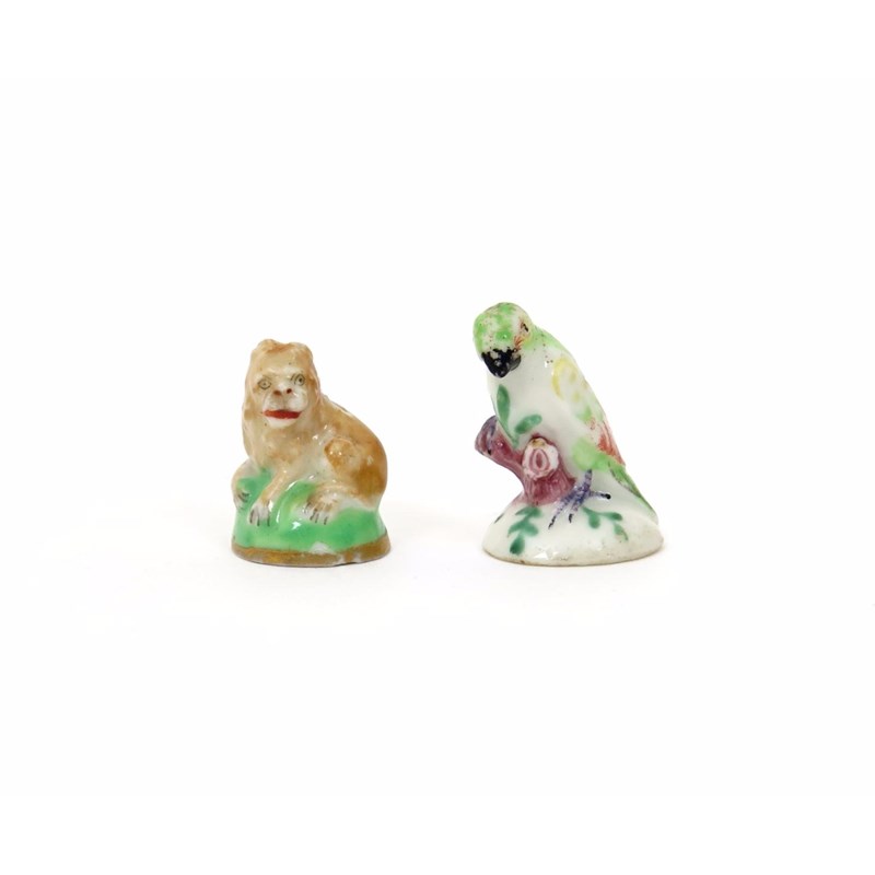 Two English porcelain fob seals c.1760-70, probably Chelsea, one formed as a parrot, brightly enamelled and perched on a low branch, the other modelled as a lion, recumbent on a grassy mound with head turned to sinister, the seals and metal fittings lacking, 2.5cm max. (2)