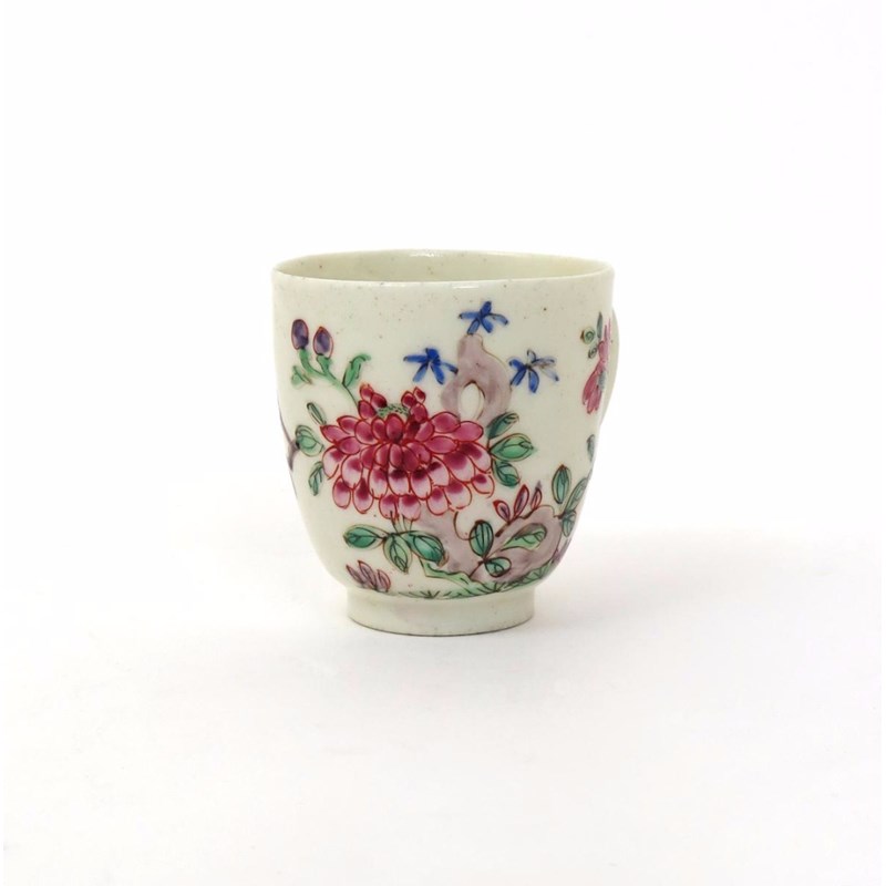 An early Bow coffee cup c.1752-54, well painted in the famille rose palette with bold sprays of flowering peony issuing from holey rockwork, an incised cross to the base, 6cm high.