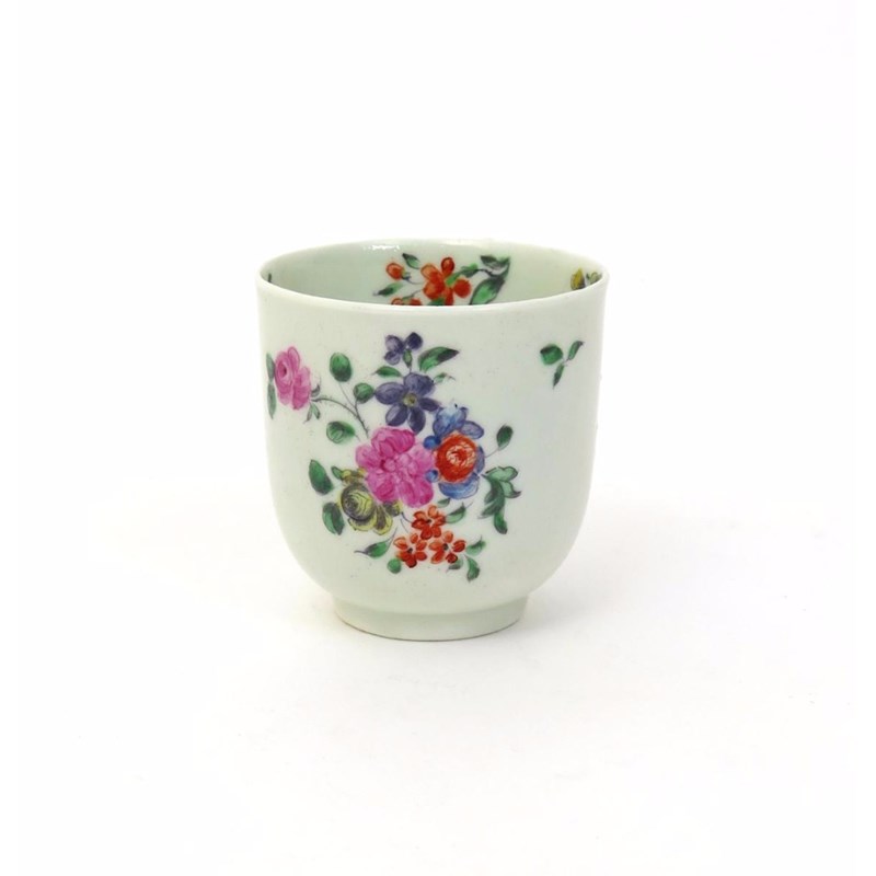A Worcester coffee cup c.1770, brightly decorated perhaps in London with sprays of European flowers, with further single sprigs to the inside rim, 6.2cm.