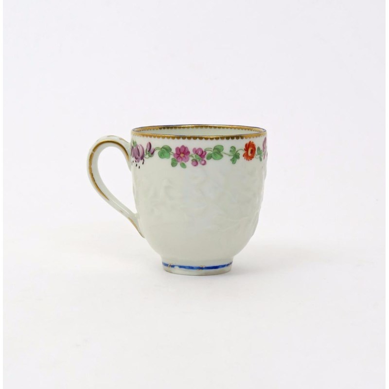 A Chelsea-Derby coffee cup c.1770-75, moulded with flowering branches, delicately painted in the Giles atelier with a band of flowers to the rim, the footrim with a Sèvres-style blue and gilt border, gold anchor mark, 7cm.