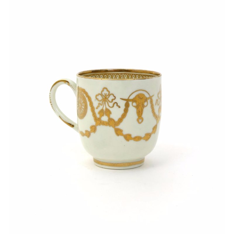 A Worcester coffee cup c.1772, decorated in the London atelier of James Giles, with the Bucrania pattern of gilt bull's heads and paterae between husk and leaf swags, the interior with a border of interlaced ovals and dots, 6.5cm.